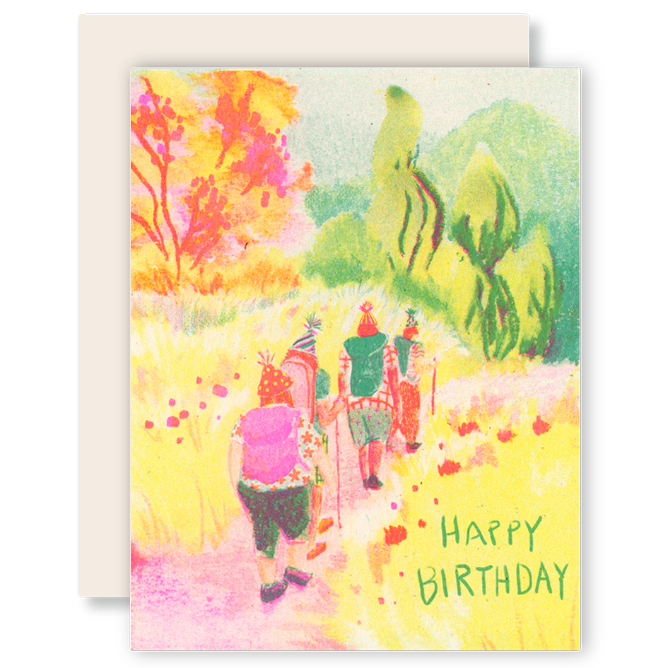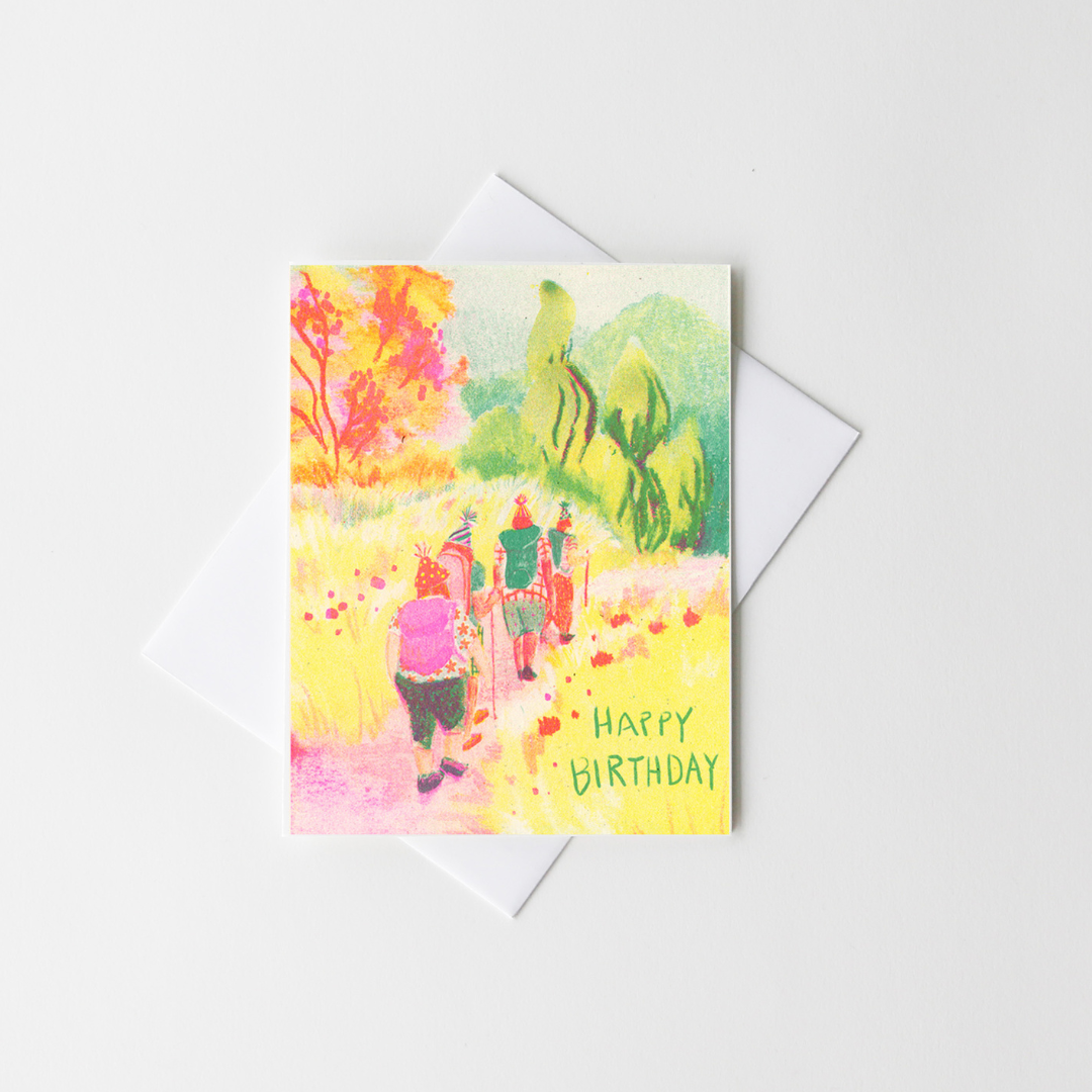 This riso-printed design features a small group of hikers making their way down a winding path, surrounded by bright, joyful color. Layers of pinks, greens, and yellows give the scene a playful energy, like sunlight filtering through trees on a good day out.